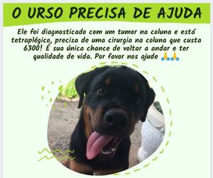 O Urso é um cachorro de apenas 4 anos que foi diagnosticado com um tumor na coluna, ele perdeu o movimento dos bracos e pernas e se encontra tetraplégico, sua chance de recuperar os movimentos é uma cirurgia que custa 6300 reais.
