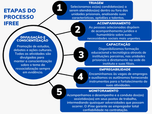 O Instituto para Formação e Ressocialização do Egresso e Encarcerado foi criado pensando em atuar em quatro pilares: empregabilidade, qualificação, assistência social e conscientização. O projeto principal do iFree é tecer parcerias com empresas, entidades, governos e tribunais, disponibilizando a expertise de nossos profissionais, de diversas áreas, a serviço da ressocialização de pessoas por meio da empregabilidade, qualificação e assistência social, com foco nas chamadas Alternativas Penais, as quais proporcionam aos indivíduos, principalmente os mais jovens, um resgate antes do mergulho na criminalidade organizada, oferecendo ações que visem a ocupação e conscientização, excluindo a necessidade do encarceramento.
