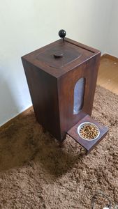 Para a fabricação do dispenser, nós utilizamos materiais de primeira linha e duráveis, de madeira usamos chapas de compensado naval, nossas tigelas são feitas de aço inox e os mecanismos são todos de aço.