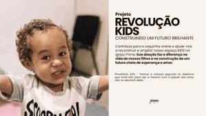Bem-vindos ao Projeto Revolução Kids! Aqui, na igreja Prime, estamos empenhados em moldar um futuro promissor para as próximas gerações. Com a missão de abençoar e fortalecer famílias, estamos lançando este espaço de doação online para reconstruir e ampliar nosso espaço KIDS.
