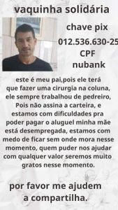 Preciso fazer alguns exames para fazer uma cirurgia, pois estou desempregado moramos de aluguel e infelizmente estamos correndo o risco de ser despejado da casa onde moramos, sempre trabalhei de pedreiro e não possuo carteira assinada, por isso não recebo nem um benefício, pois minha esposa esta desempregado e temos uma filha de 15 anos que tomou a iniciativa de promover esta vaquinha obrigado
