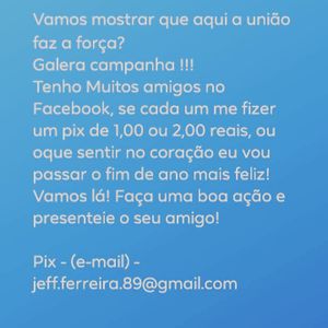 Venho aqui abrir meu coração,sem medo de ser julgado por ninguém. Todos sabem a minha luta digna pra ter condições de subsistência. Nos últimos 6 anos estou impossibilitado de realizar qualquer trabalho,e muitas vezes é constrangedor principalmente na minha idade. Há questões físicas e psíquicas que precisam ser reformuladas. Como eu não sou de fugir a luta,peço seu apoio.Um real que seja,pra reerguer um amigo. Obrigado