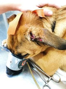 Toddy foi devolvido com machucados, feridas e cicatrizes, necessitando de cuidados veterinários e sutura na orelha. Muito reativo e assustado demonstrando que novamente passou por maus tratos.