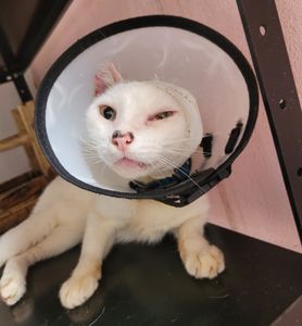 Branquinho é um gatinho resgatado das ruas, que convive com a FeLV (leucemia felina), e está lutando contra o câncer de pele (carcinoma de células escamosas).