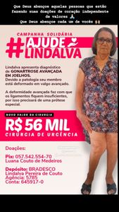Me chamo Luana venho por meio dessa vaquinha pedir a ajuda de vocês para a campanha da minha mãe! Ela precisa urgentemente realizar uma cirurgia Artroplastia total nos dois joelhos, o valor da Cirurgia é 56 mil reais.