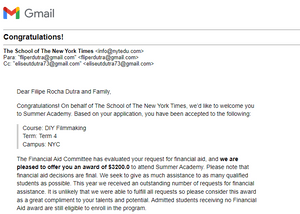 Conclui as etapas do processo (Redações, análise de histórico escolar, entrevista do Times com professor) e para minha alegria fui aprovado. O curso é na minha área, DIY Filmmaking ("produção de vídeos").