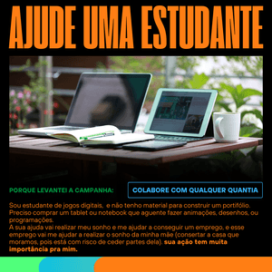 Meu nome é Suellen e sou estudante de Jogos Digitais. Estou buscando apoio para comprar um tablet ou notebook que suporte a criação de animações, desenhos e programações. Esse equipamento é crucial para que eu possa construir meu portfólio e conseguir um emprego na área de jogos.