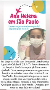 UMA TERESINENSE, QUE AOS CINCO ANOS JÁ SENTE NA PELE A FORÇA DE UMA GRAVE DOENÇA, DIAGNOSTICADA COM LEUCEMIA LINFOBLÁSTICA AGUDA, PASSOU 38 DIAS INTERNADA, INCLUSIVE NA UTI, A FAMILIA COM MUITA LUTA CONSEGUIU UMA VAGA EM UM HOSPITAL ESPECIALIZADO EM CÂNCER INFANTIL EM SÃO PAULO, A PEQUENA ANA HELENA PRECISA DE SUA GENEROSA COLABORAÇÃO PARA ESSA SEGUNDA FASE DO TRATAMENTO E REVERTER ESSE QUADRO.