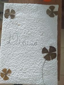 Faço os cadernos com papel reciclado, eu mesma faço as folhas, costura manual, e toda a decoração. O trabalho está no começo,, ainda tem muito o que aperfeiçoar e crescer