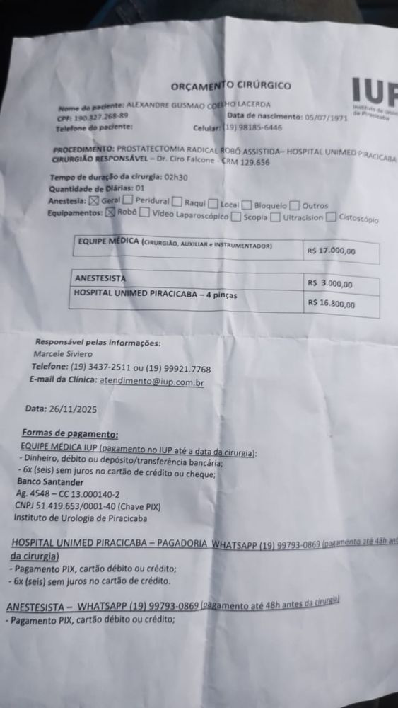 Pagamento de Cirurgia Unimed Piracicaba.