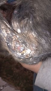Ela está com esse machucada que nunca cicratiza,já demos antibiótico,pomada ,e agora queridos leva ao veterinário para acabar com sofrimento dela que sente dor.