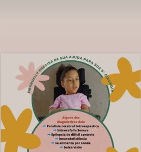 Olá Que Deus abençoe a todos, estou pedindo ajuda pra vcs com qualquer valor desde que seja de coração qualquer valor será bem vindo, essa campanha e em prol da Emanuelly uma criança linda e doce cheia de sonhos e uma longa vida pela frente, precisamos de ajuda pra arcar com remédios exames e cirurgia está e a 9° cirurgia, conto com a ajudar de todos vcs por favor, Não deixem que o senhos dela se acabe por favor! E quero pedir a todos orações por favor, orações não vai custar nada pra vcs porém para nossa Emanuelly vai ajudar muito na fé venceremos.