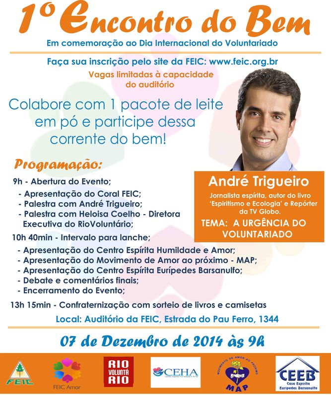 No nosso primeiro ENCONTRO em 2014 recebemos na FEIC amigos como o Jornalista, Professor e Escritor, André Trigueiro, a Diretora Executiva do RIO-Voluntário, Sra. Heloísa Coelho e diversos outros representantes de instituições que realizam trabalhos sociais no Rio de Janeiro e no Brasil e ajudam a milhares de pessoas em situação de vulnerabilidade social, para uma rodada de palestras, troca de experiências e um delicioso lanche beneficente.