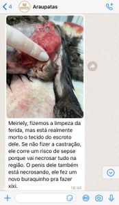 Uma senhora o resgatou, porém, sem condições financeiras para quaisquer gastos com atendimento veterinário, pediu ajuda no Facebook tentando encontrar seu tutor, pois o animal não andava utilizando as patas posteriores. Ninguém apareceu infelizmente, e eu me ofereci para ajudar. Foi chamado o veterinário que atende o munícipio para o atendimento, concluiu-se que o animal havia sido atropelado, foi medicado e seguiu tratamento na casa dessa senhora, porém, como é apenas um veterinário para atender toda a cidade, suas lesões agravaram-se, teve infestações de miíase (bicheira) e logo em seguida o tecido da região genital e lateral começou a necrosar. Foi internado na quinta-feira (04/08/22) com o quadro de infecção, necrose e estava com desidratação.