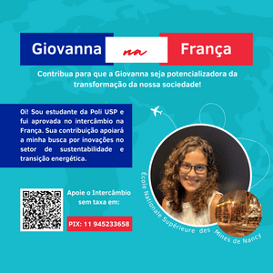 Oi! Sou Giovanna Loredo, estudante de Engenharia de Minas na Poli-USP. Como aluna de escola pública e a primeira da minha família a ingressar em uma universidade pública, estou enfrentando um novo desafio: arrecadar recursos para o meu intercâmbio de 14 meses na École Nationale Supérieure des Mines de Nancy. Muito além de imergir na cultura francesa e me aprofundar nos temas de ESG e transição energética, espero ter o privilégio de representar o Brasil na França e de poder retribuir à nossa sociedade, especialmente à mineração brasileira.