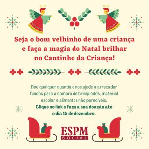 A época natalina não é sobre presentes, é sobre presença. Pensando nisso, a ESPM Social decidiu desenvolver uma Campanha de Natal em parceria com a Co.De. Com o intuito de arrecadar fundos, estaremos recebendo doações para compra de brinquedos, material escolar e alimentos não perecíveis e, posteriormente, os distribuiremos no Cantinho da Criança, uma pré-Escola com crianças de 1 a 6 anos. Doar transforma vidas e beneficia tanto quem doa quanto quem recebe, nos ajude a fazer esse fim de ano mais feliz. 🎄❤ Clique no link e faça a magia do Natal brilhar para uma criança!
