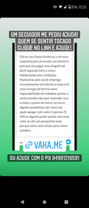 Olá me chamo André, estou desempregado, passando uma situação complicada tive hérnia iguinal bilateral e precisei passarr por uma segunda cirurgia, estou precisando de dinheiro para remédios, alimentos, e pegar um aluguel vencido. conto com a ajuda de vocês .