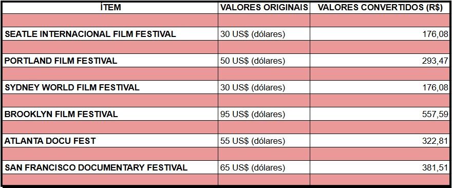Fizemos a pesquisa de alguns dos festivais atuais para que tenham uma ideia dos custos de inscrição