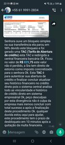 Pessoal, eu venho aqui desesperada relatar um golpe q sofri no WhatsApp, como vcs podem ver na imagem, fui fazer uma empréstimo para pagar as contas e ajudar meus pais e aí fui roubada, uma falsa agente de crédito do banco BRB pediu pra pagar umas taxas alegando q esse valor seria reembolsado e q eu teria meu empréstimo, no final das contas fui lezada com 1.879,74. Fiz o B.O de ocorrência mais eles disseram q era quase impossível recuperar de volta visto que ela já sacou o dinheiro da conta. Agora me encontro desesperada pra pagar o aluguel, as contas e sem ter o q comer e a quem recorrer, ajudo meu pai catando fio de cobre para queimar e vender e agora nessa situação onde o dinheiro de casa foi levado nos encontramos desesperados por ajuda!