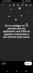 Se 10 pessoas doarem $315 para a minha campanha de arrecadação de fundos, consigo atingir o objetivo da minha campanha pra eu conseguir pagar essa medicação! Você poderia me ajudar a realizar esse alívio pra minhas dores ?eu imploro ..