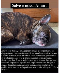 Amora tem 4 anos, é uma cachorra amiga e companheira, foi diagnosticada com um sério problema na coluna cervical, perdeu a mobilidade das patas traseiras e sente forte dores, precisamos de ajuda para pagar seus exames, medicamentos, cirurgia e fisioterapia. Por favor nos ajude para que a Amora fique curada.