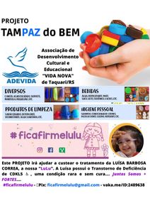 DESCRIÇÃO: A ADEVIDA irá disponibilizar Bombonas a comunidade, para a arrecadação de Tampas Plásticas em geral, onde que terá locais de coleta fixas em Imóveis Públicos, Escolas, Restaurantes, Igrejas, Condomínios, e em empresas públicas e privadas. A ADEVIDA também ficará responsável na coleta, higienização, separação e também na venda deste material as empresas recicladoras. Onde o valor arrecadado na venda, será pago os custos de mão de obra e transporte e o restante será destinado a AJUDAR a custear o tratamento da LUÍSA BARBOSA CORRÊA, a nossa LuLu... A LUÍSA possuí o Transtorno de CDKL5. Uma condição rara e sem cura. Onde esta família tem um grande custo para manter sua saúde estável, e seu tratamento é caro, onde tem alto gasto mensal através de medicamentos, suplementos, transporte e fisioterapia diária , para buscar uma melhor qualidade de vida para sua filha.