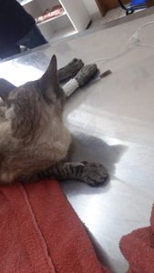 Terça feira, dia 21 de dezembro, eu e meu amigo, achamos essa gata adulta bem debilitada em baixo de um carro próximo à minha casa. Ela aparenta ser da rua, sem nenhum dono e adotou um filhote que também estava com ela e que está nas fotos e nos videos presentes.O único problema que estamos tendo agora é: eu e meu amigo somos desempregados e não temos renda para completar o valor total dos exames, consulta e internação. O valor total deu 560,