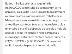 Eu sou mirelle tenho 17 anos,e criei essa vaquinha de R$30.000,00 com intuito de comprar um carro para meu pai.No dia 24 ele foi assaltado e levaram o carro.O carro é o único meio de trabalho dele. Meu pai quitou o carro e iria colocar no seguro mas antes disso acontecer teve esse imprevisto, a vida financeira da família dependia do veículo e hoje ele não sabe como irá manter a renda. Para mais informações entrem em contato com os números (71)991822192 e (71)992957353. Sua ajuda é muito importante para manter uma família.