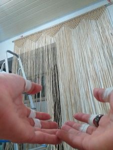 Eu trabalho sozinha com o macramê, as vezes meu café da manhã e outraa refeições são feitas de frente a cada peça. Algumas me tiram horas, outras, me tiram dias, ja troquei dia pela noite e assim levo meu tear a todos que puder. Produzo bolsas, me leva 72 horas de produção, suporte para plantas, painéis de todos os tamanhos, cores e formas. Ja fiquei semanas sem poder trabalhar devido ao movimento repetitivo, me causou lesão no punho, mas em todas as produções fico com bolhas nas mãos, ainda assim, essa dor e queimaduras entre os dedos não diminuem o amor que tenho pelo macramê.